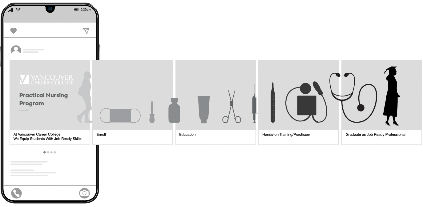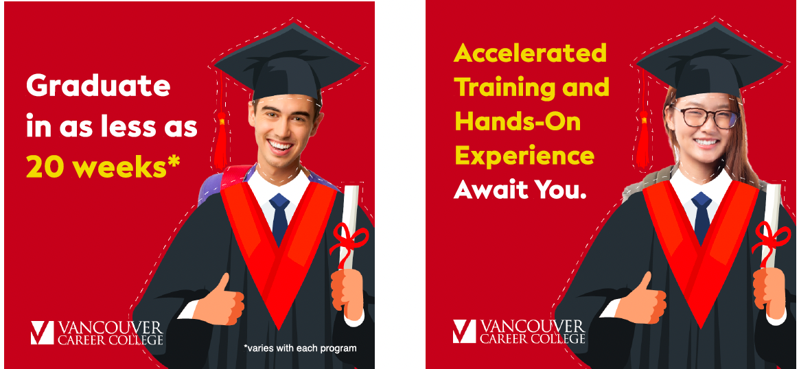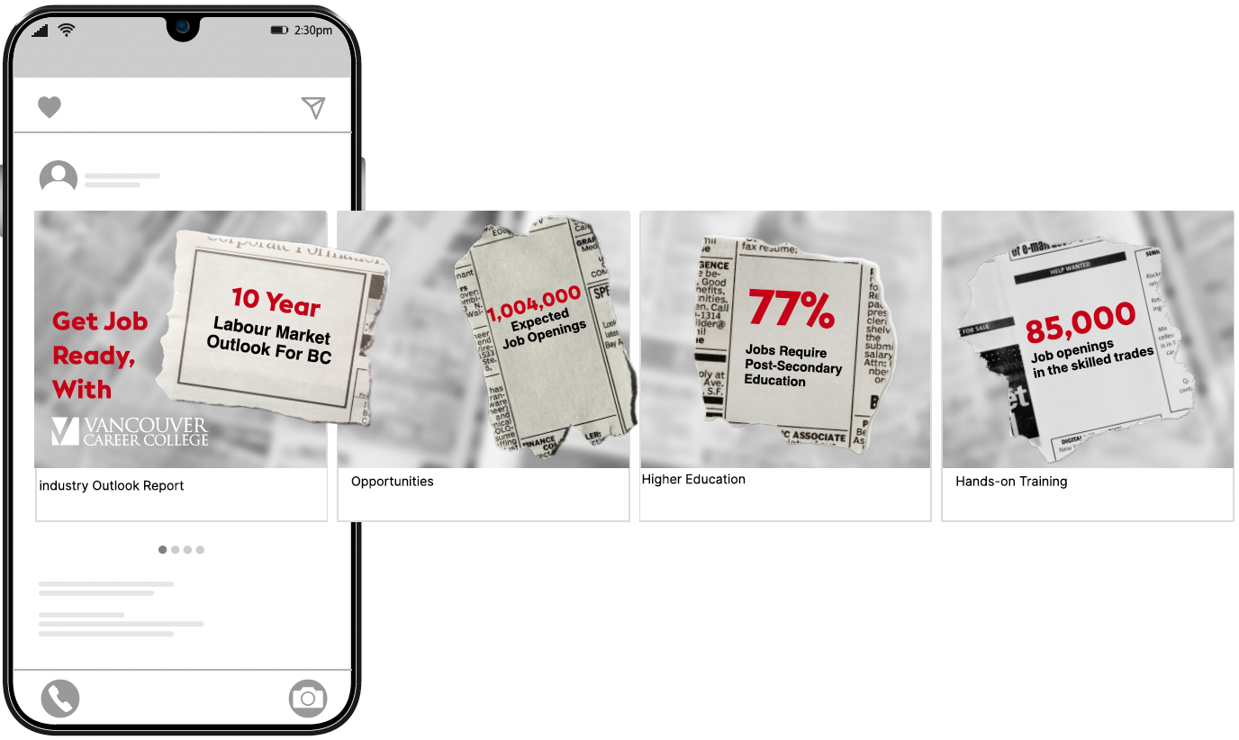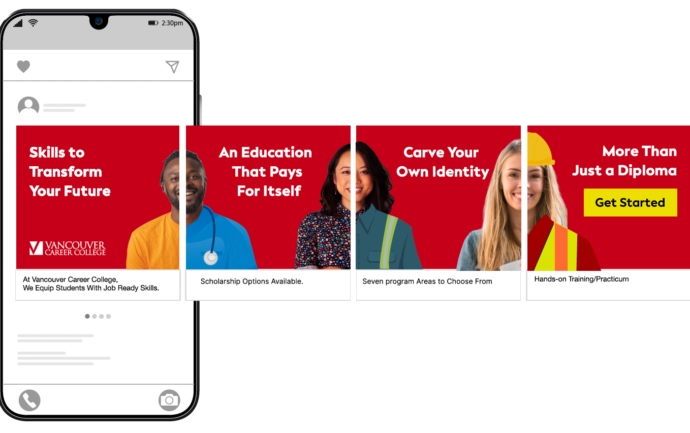 This was done for Vancouver Career College's ad campaigns. The ad shows the evolutionary process of starting at one of Vancouver Career College's programs to becoming a professional in your desired field. This idea was a great fit for carousel designs and motivates people to dream big!